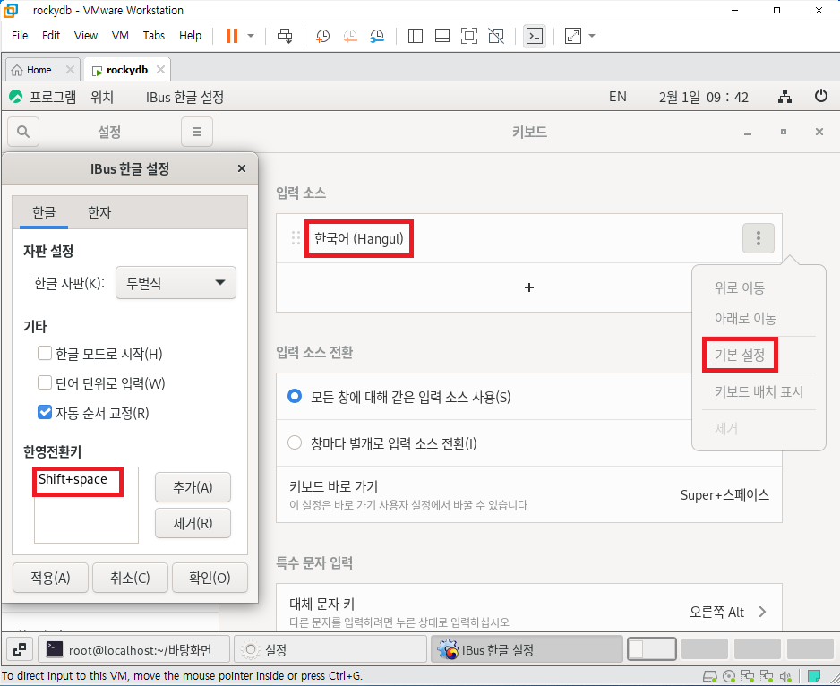 입력소스가 '한국어'로 되어있는데 '한국어(Hangul)'로 바꾸셔야 합니다.